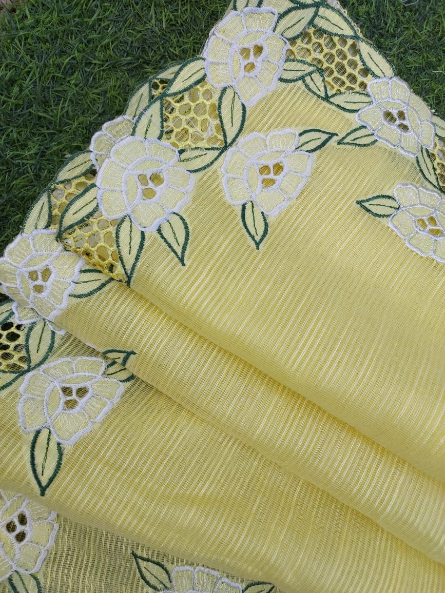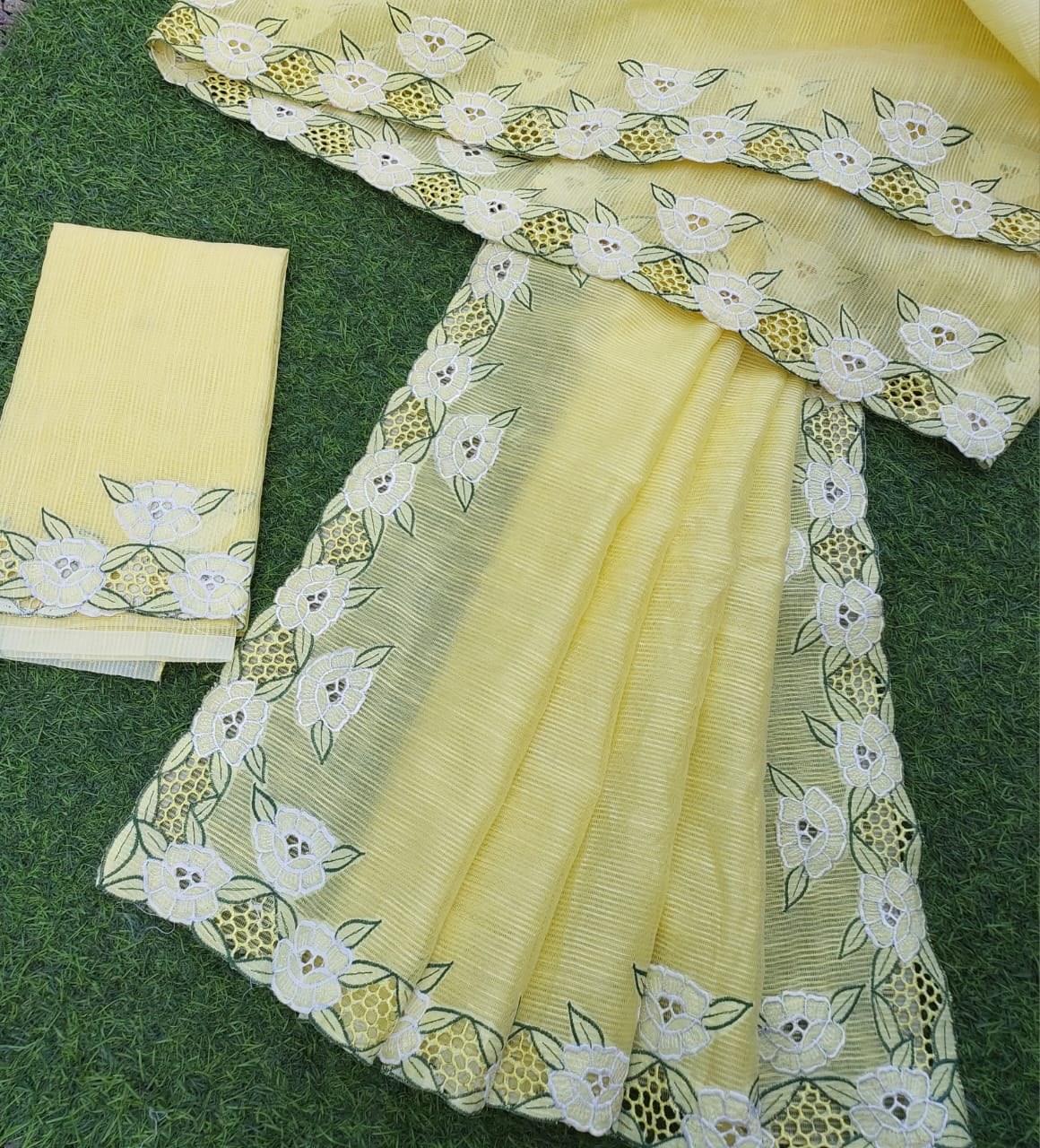Lemon yellow noil Kota cutwork saree and blouse