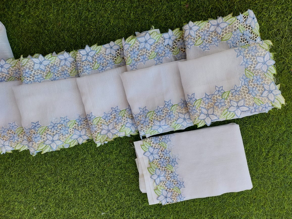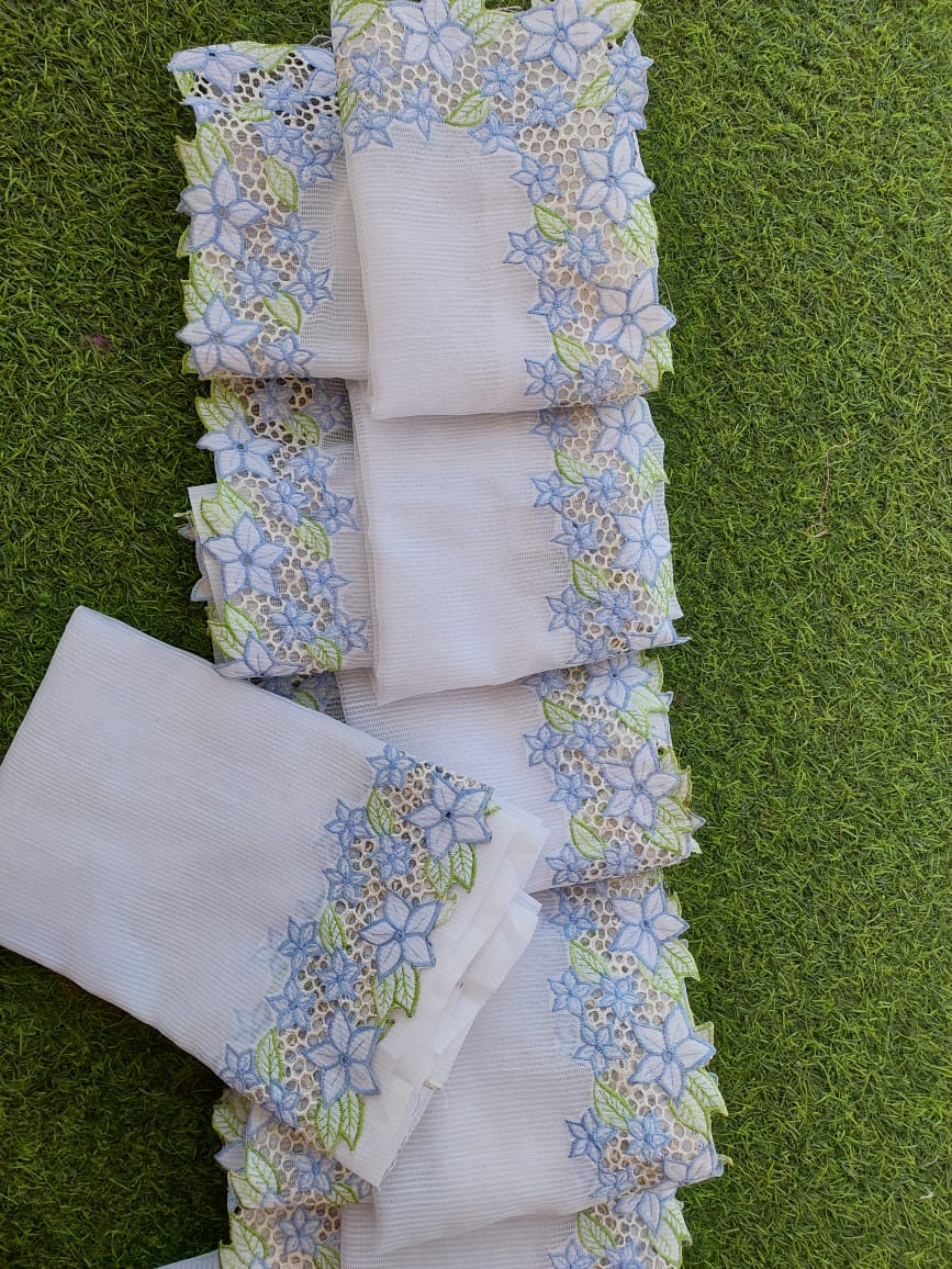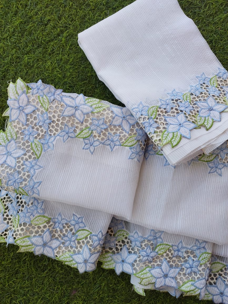 Elegant white saree with intricate cutwork, highlighted with delicate powder blue floral embroidery. Paired with a matching blouse, perfect for a graceful and timeless look.