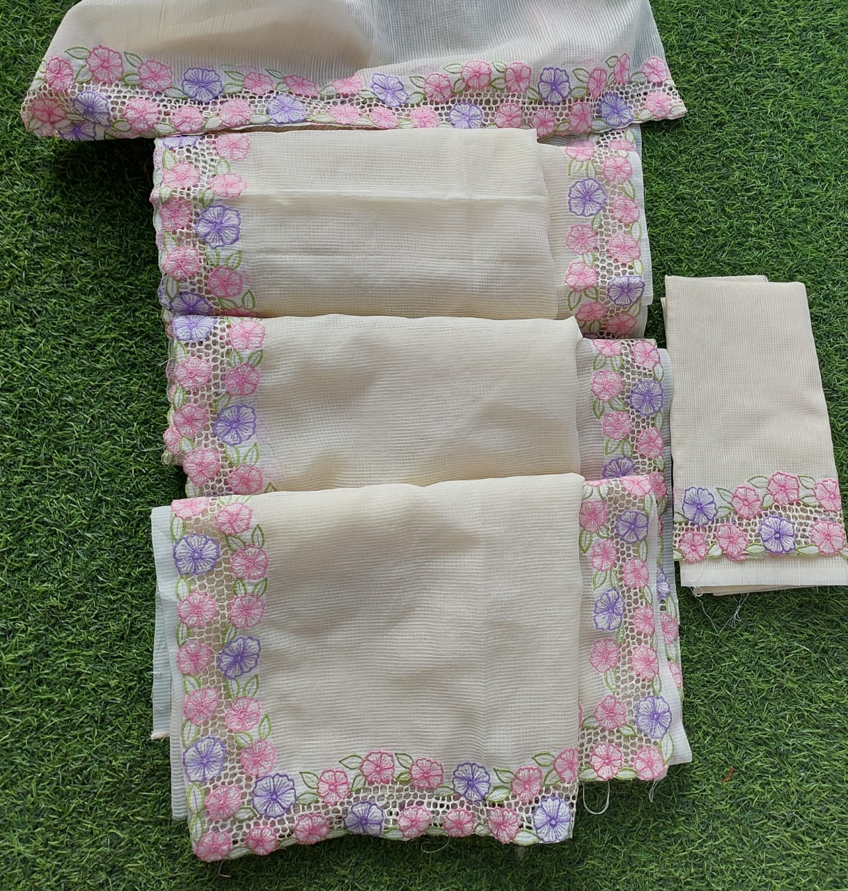 "Elegant and timeless, this cream-colored cutwork saree exudes sophistication with its intricate patterns crafted to perfection. Paired with a matching blouse, this ensemble is ideal for those who appreciate understated luxury and fine craftsmanship, making...