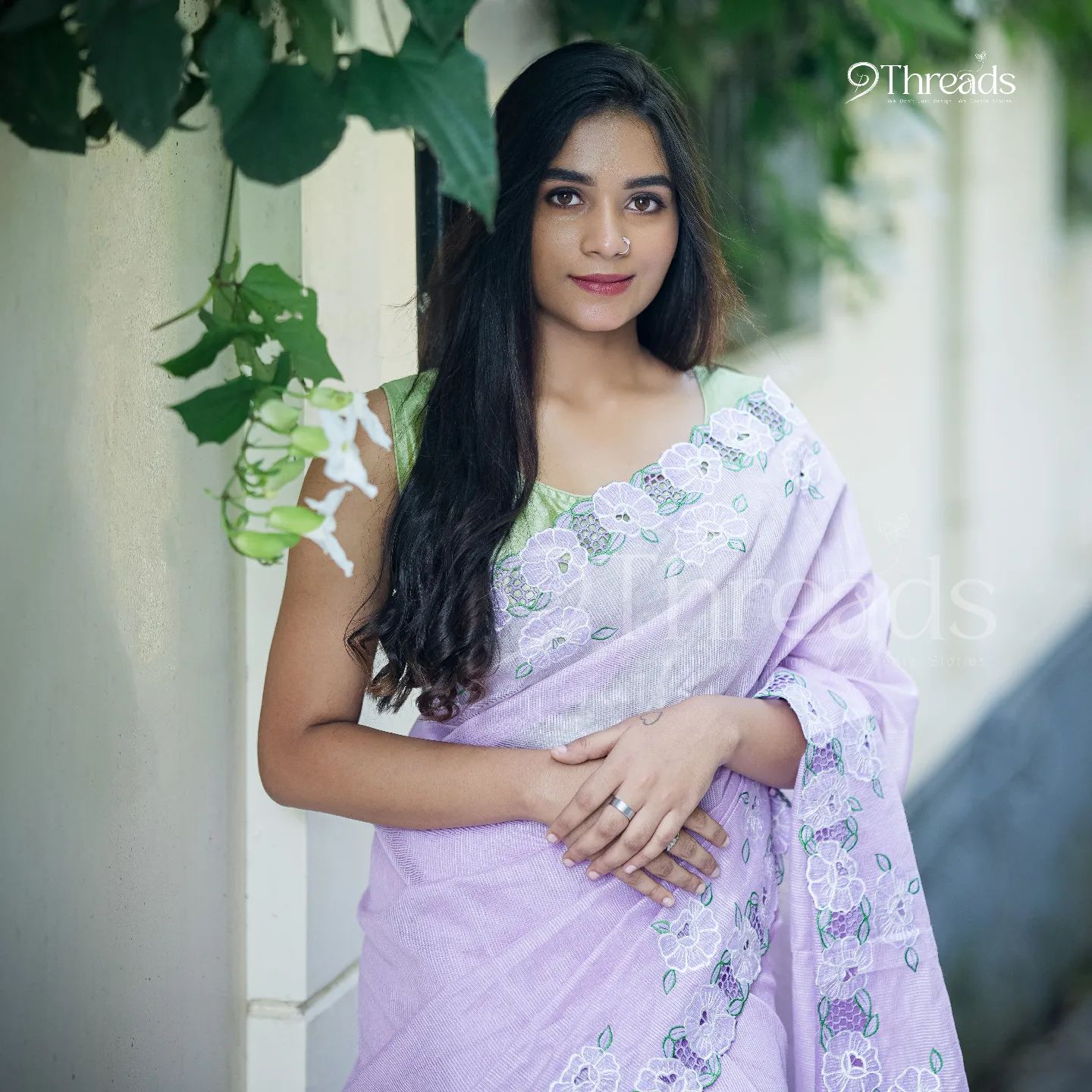"This lavender noil Kota saree from 9threads brings a soft, graceful touch to traditional wear with its exquisite cutwork detailing. The lightweight, breathable fabric drapes effortlessly, creating a look that's both refined and versatile. Paired...
