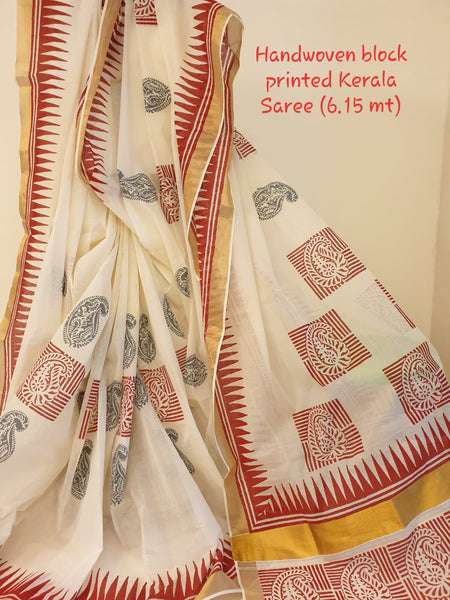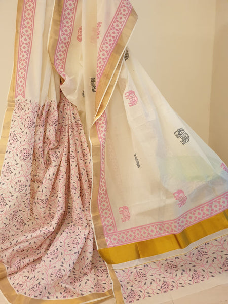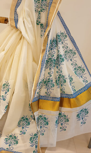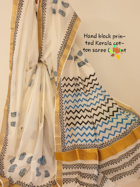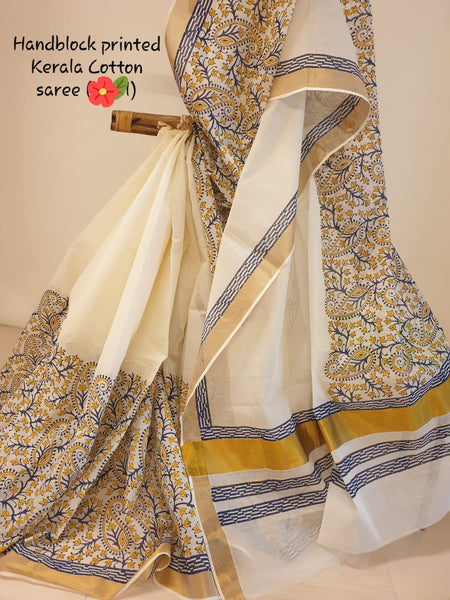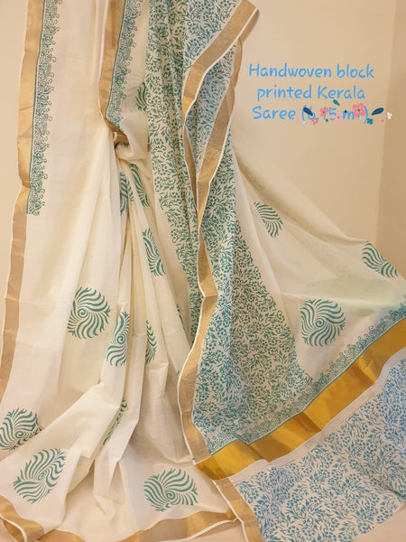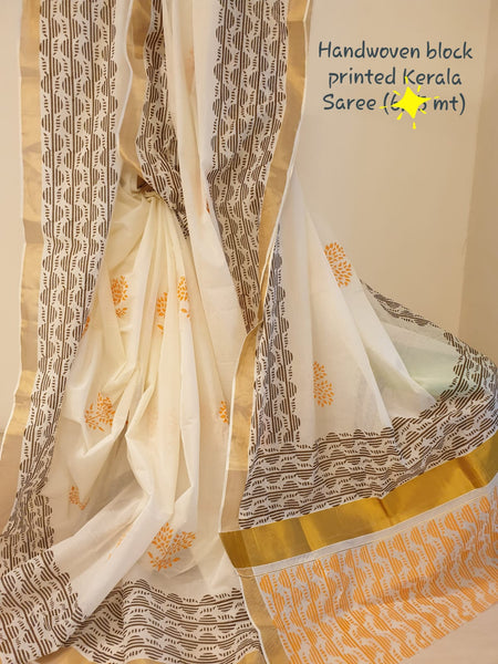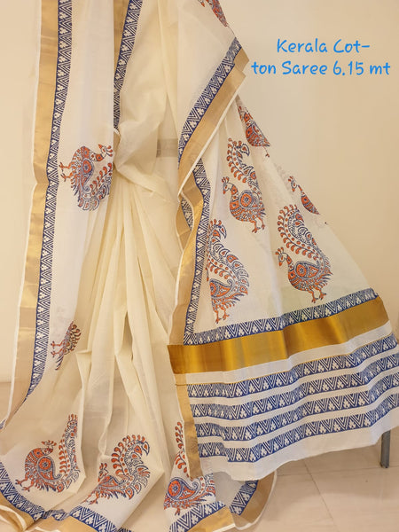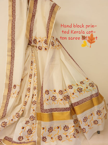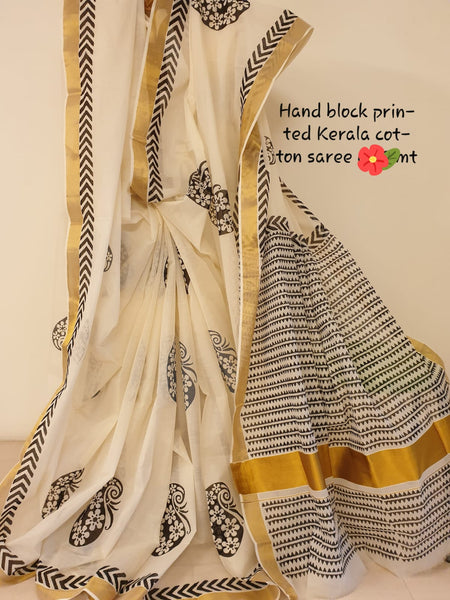 Powerloom Handblock Printed Kerala Cotton Sarees with running blouses Premium quality