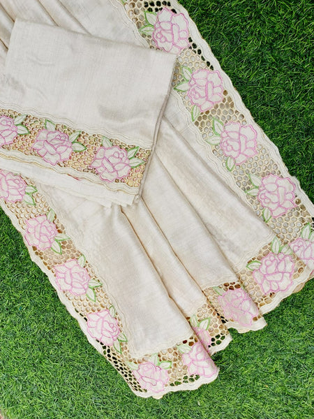 "Elegant Linen Cutwork Saree with Matching Blouse"