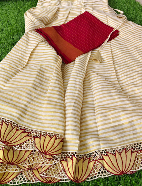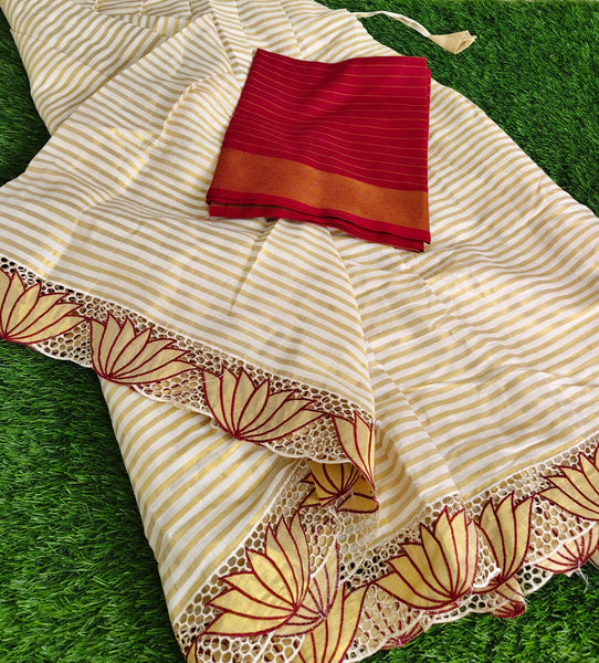 "Elegant Linen Cutwork Saree with Matching Blouse"