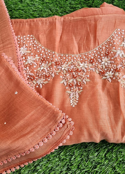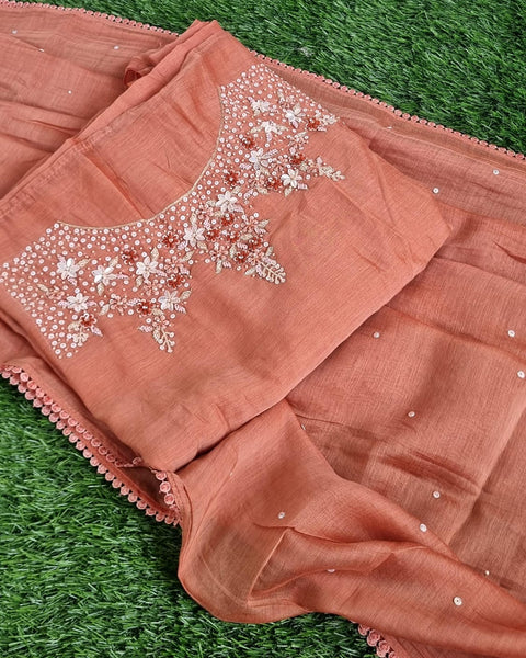 Beautiful rust-colored pure glass Chanderi top and dupatta featuring exquisite floral embroidery with delicate sequin highlights. The dupatta is finished with a charming lace border for added elegance. Paired with a pure Shantoon bottom for...