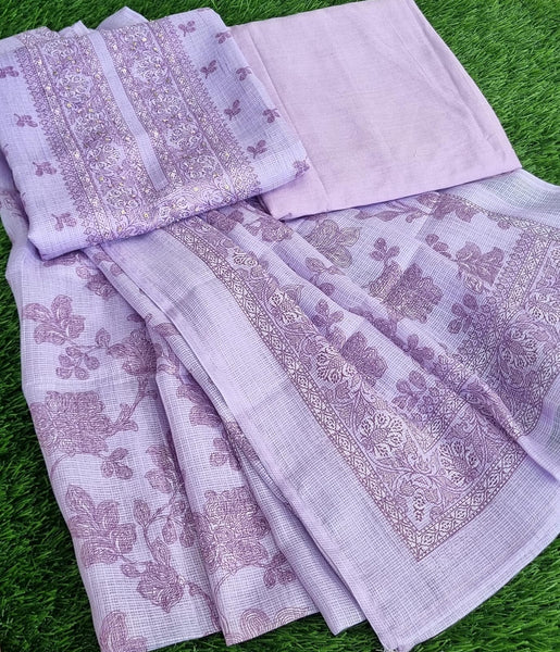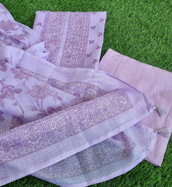 Elegant lavender Kota set featuring a beautifully woven top with delicate sequin and thread embroidery, a floral motif Kota dupatta with zari border, and a plain cotton bottom. Perfect for summer gatherings, casual outings, and...