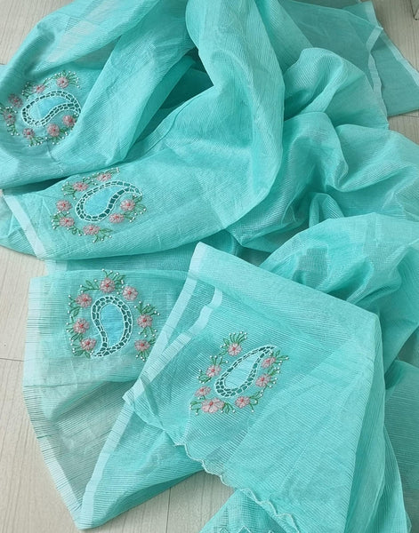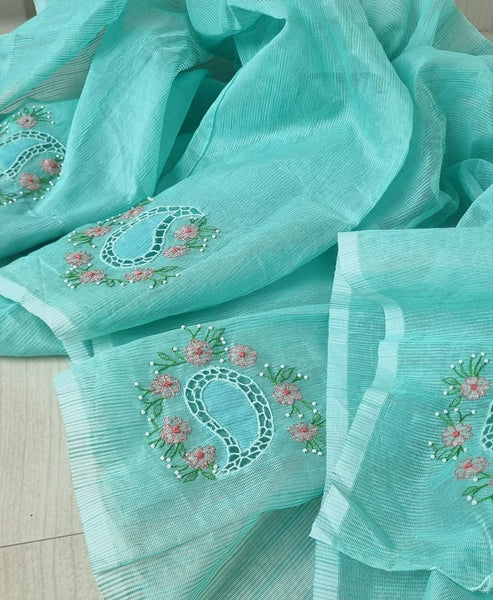 "Graceful Pista Green Noil Kota Cutwork Saree with Matching Blouse"