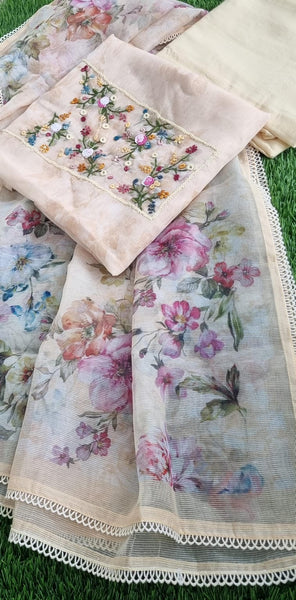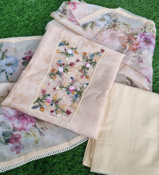 Charming pastel peach dress material set with beautifully hand-embroidered floral top, paired with a soft floral-printed dupatta and matching bottom. A perfect pick for a graceful and refreshing ethnic look.
