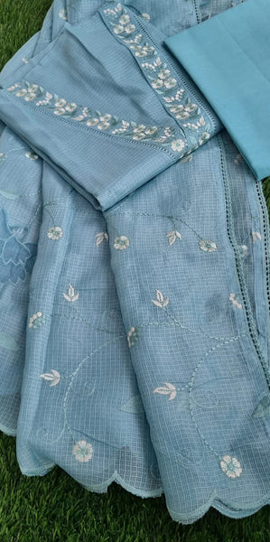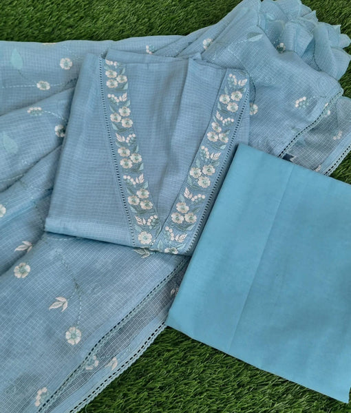 Soothing sky blue cotton dress material set featuring delicate white floral thread embroidery on the top and dupatta. The soft texture and subtle detailing make it perfect for comfortable everyday wear or graceful casual outings.