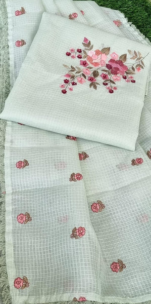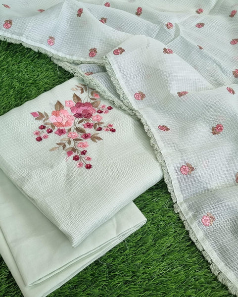Pastel mint green Kota top and dupatta set with beautiful pink floral embroidery. Paired with a matching plain mint green cotton bottom. Lightweight, breathable, and perfect for summer wear, casual outings, or festive occasions.