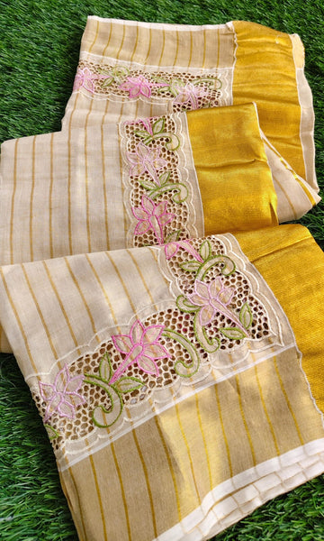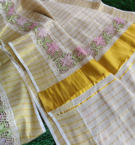 Elegant Kerala saree with golden checks, highlighted by delicate floral embroidery and intricate cutwork detailing. A perfect Onam special drape that blends festive tradition with graceful charm.