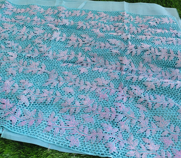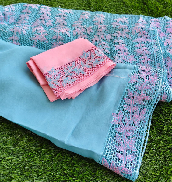 ✨ Elegant Korean Silk Saree featuring delicate full border cutwork and matching sleeve design. The pallu comes with 1 meter of intricate work, making it a perfect blend of grace and charm.