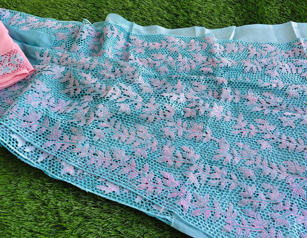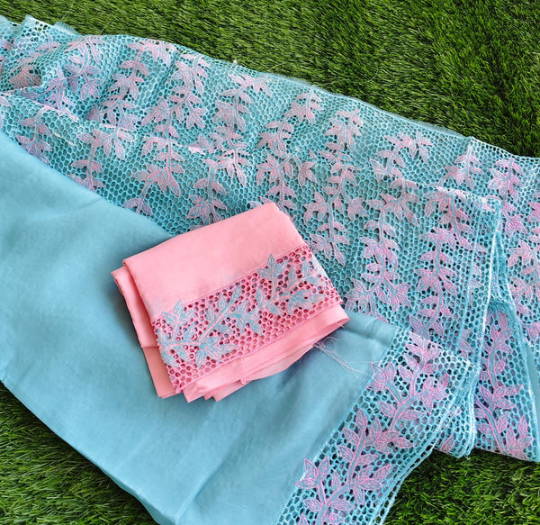 "Elegant Linen Cutwork Saree with Matching Blouse"