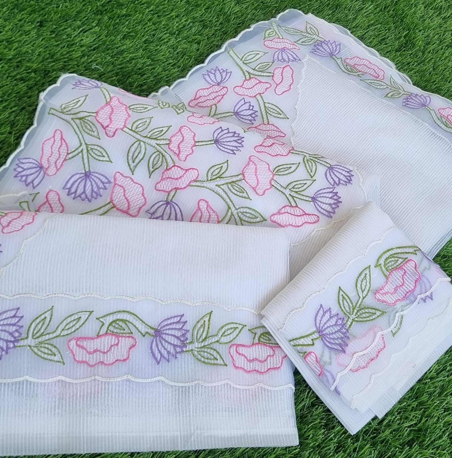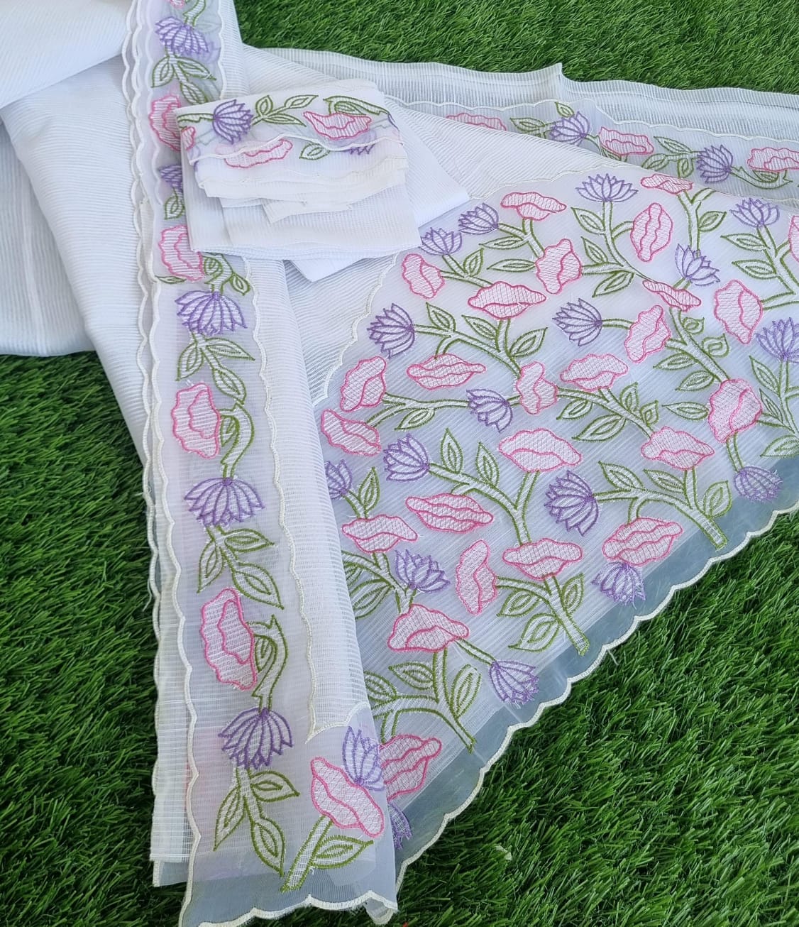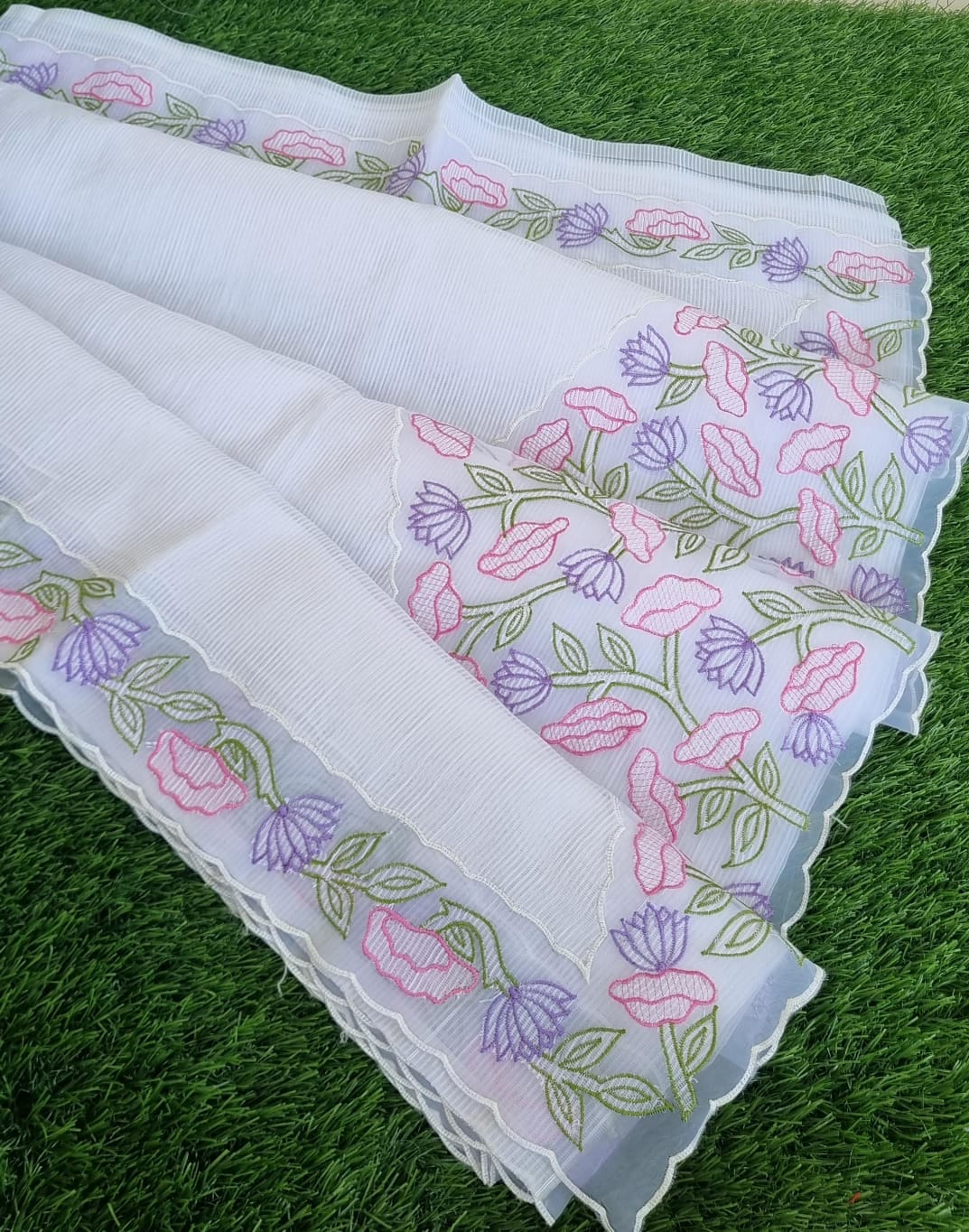 Beautiful white Kota saree with applique work featuring pastel pink and lavender floral motifs with green leaves. The delicate embroidery along the border adds an elegant touch, perfect for summer or festive occasions.