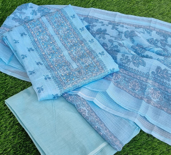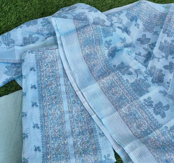 Elegant sky blue Kota Doria suit set featuring beautifully detailed thread and mirror embroidery on the top. Comes with a matching printed Kota dupatta and a soft plain cotton bottom. Perfect for summer wear, casual...