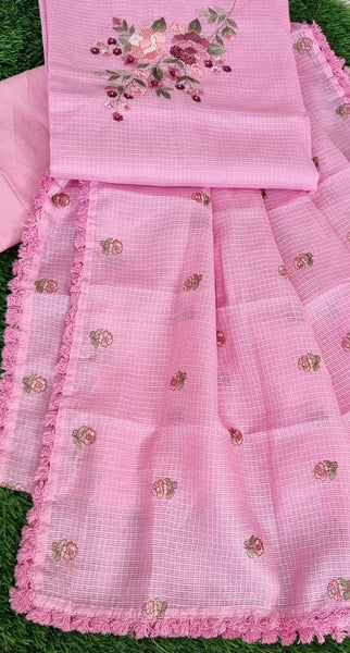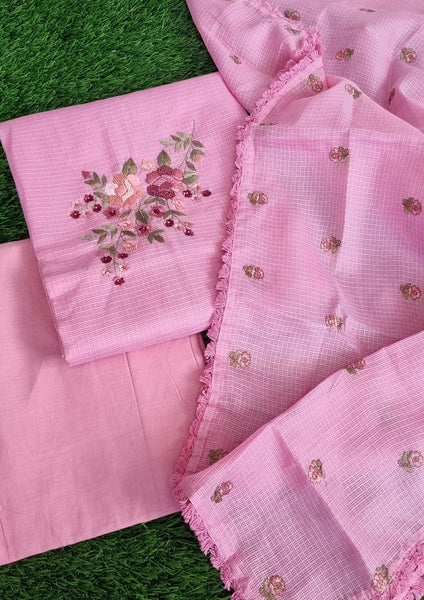 Beautiful pink Kota top and dupatta set with elegant floral embroidery in shades of green and darker pink. Paired with a matching plain pink cotton bottom. Lightweight and airy—perfect for summer, casual wear, or festive...