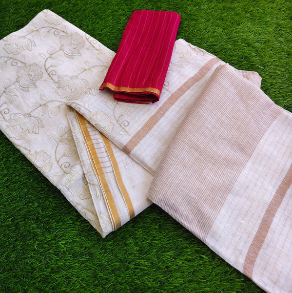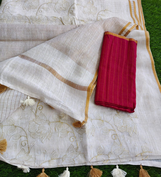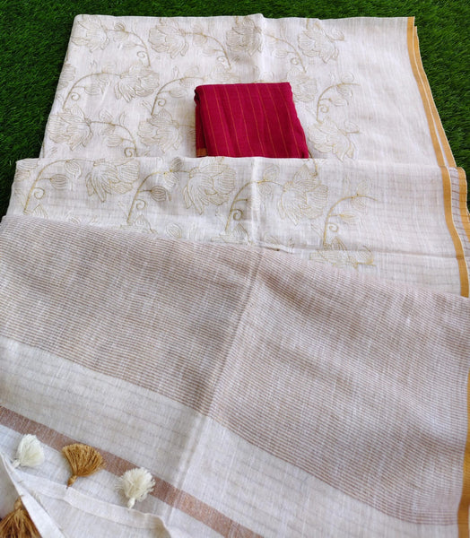 Elegant linen saree with delicate floral embroidery, paired with a contrasting blouse for a graceful festive look. Lightweight and classy, perfect for traditional occasions and celebrations.