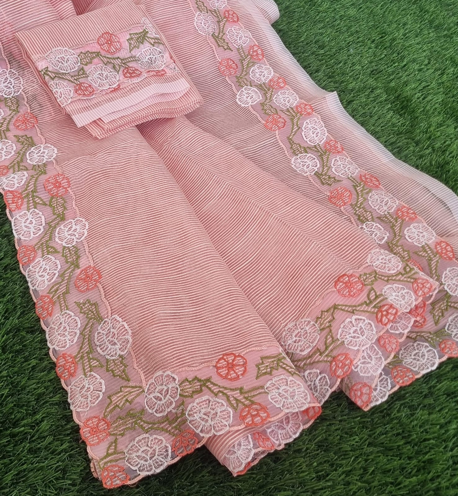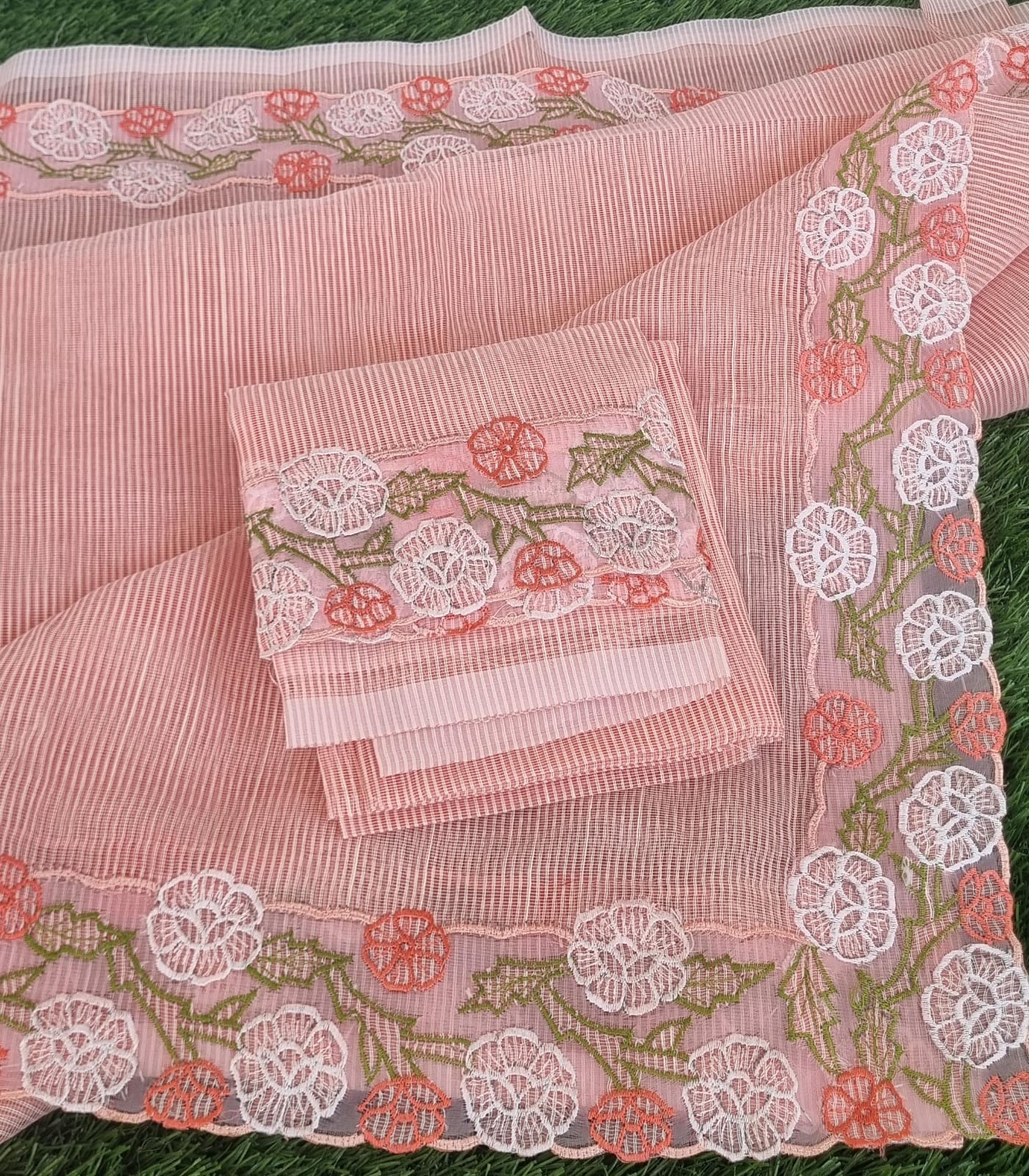 Heavy Applique Work on pallu , Scattered work on body , Kota Saree with Blouse. Peach color