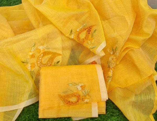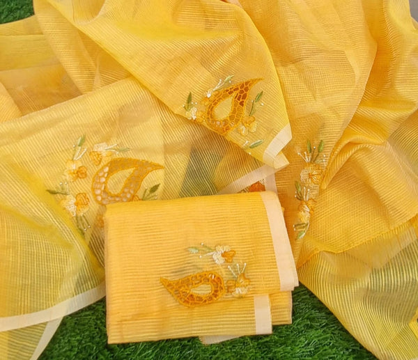 Noil kota mango yellow color kota cutwork twine saree and blouse