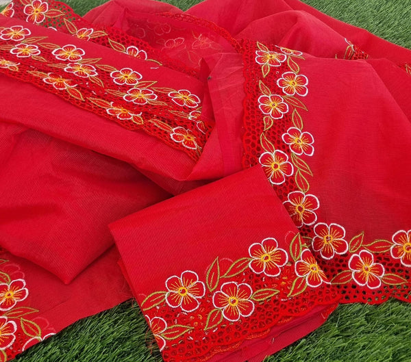 Noil kota red color cutwork saree with blouse