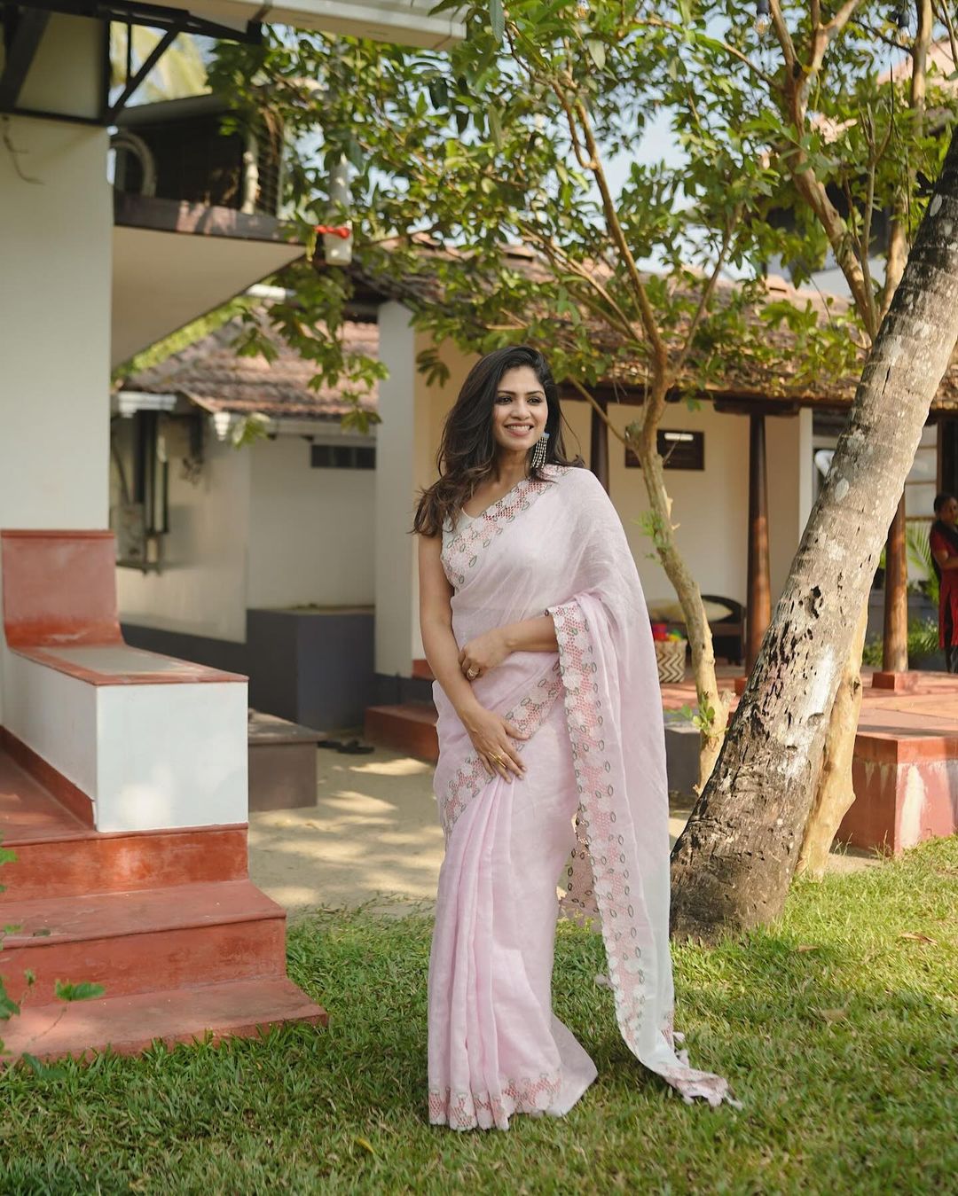 Elegant Light Pink Linen Cutwork Saree with Blouse