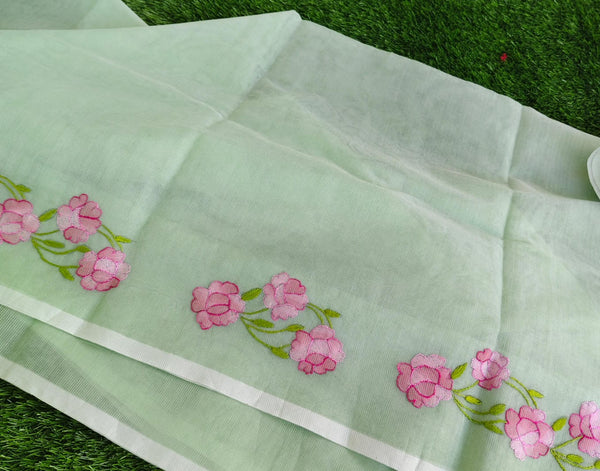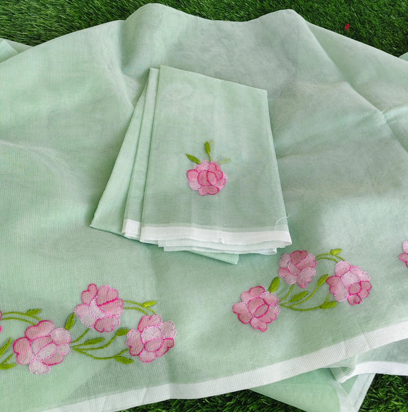 Soft pastel green Kota fabric adorned with beautiful pink floral shadow embroidery. Comes with a matching blouse piece featuring delicate floral detail.