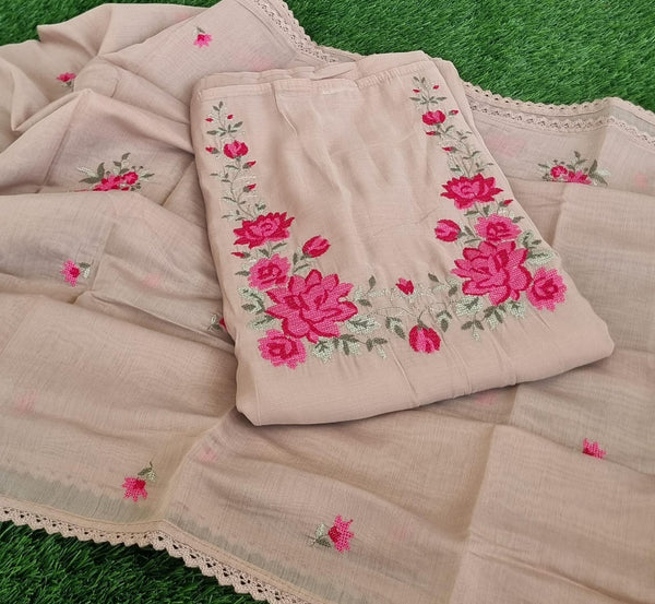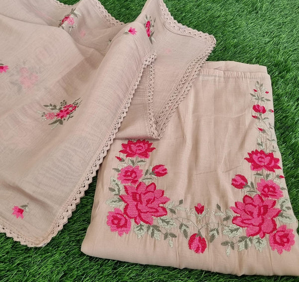 Pure silk top with elegant cross-stitch embroidery in floral patterns. The matching dupatta also features beautiful embroidered motifs for a coordinated look. Comes with a pure shantoon bottom for comfort and style. A perfect choice...