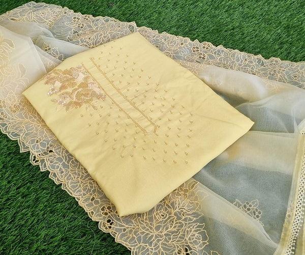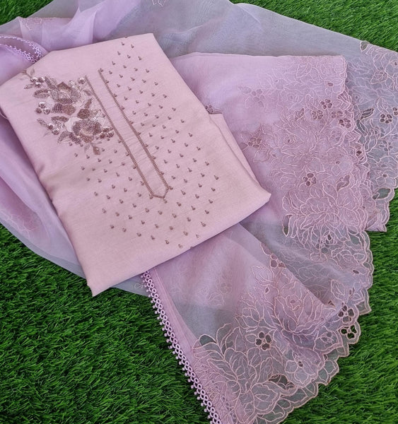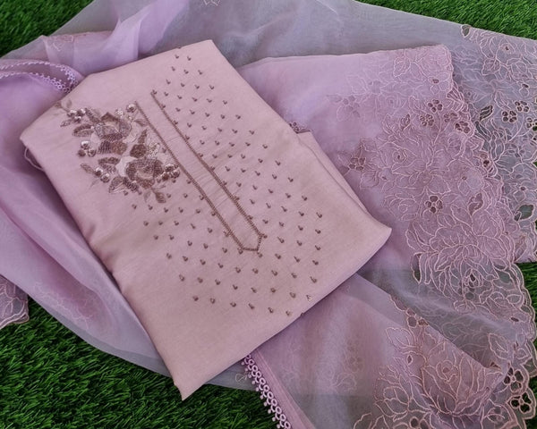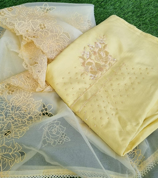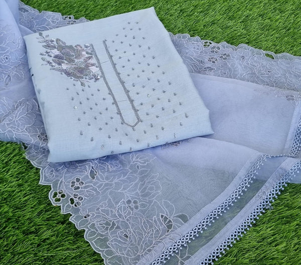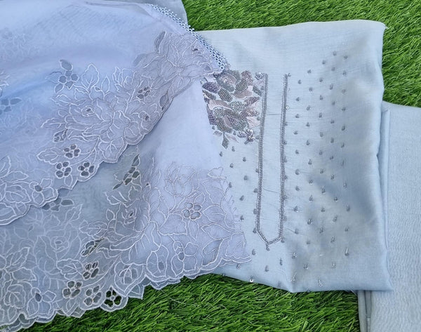 π¦πΈPure silk top with elegant bead and thread embroidery. Paired with a beautiful organza dupatta featuring intricate cutwork detailing. Comes with a pure shantoon bottom. A perfect choice for sophisticated and timeless ethnic style.