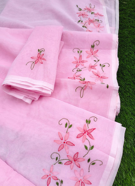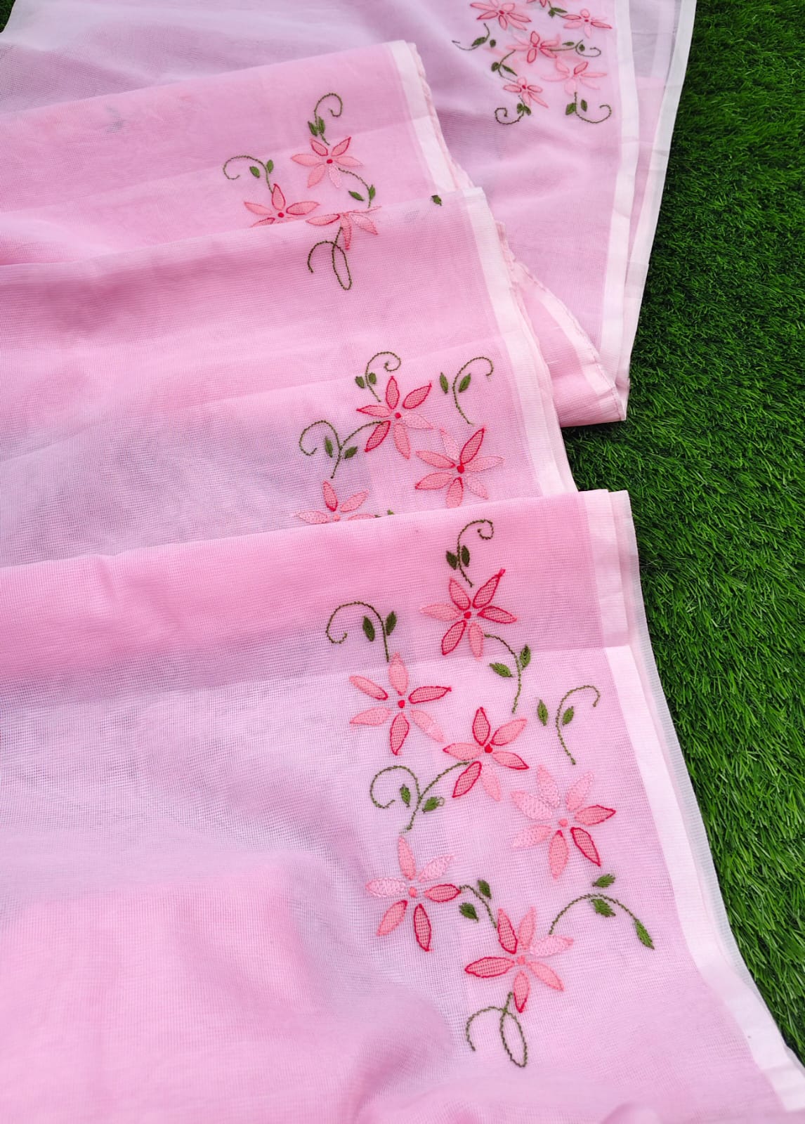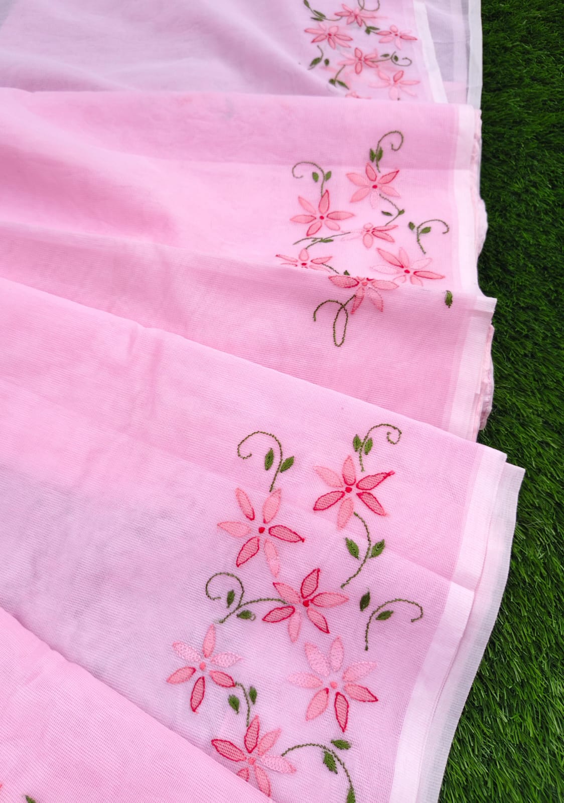 "Delicate Pink Linen Cutwork Saree with Matching Blouse"