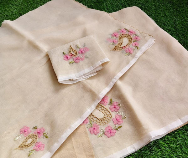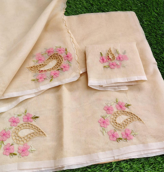 ๐ฆ๐ธElegant Silky Kota twine cutwork saree in a soft beige shade, adorned with delicate floral embroidery in pink and green. Comes with matching blouse piece, perfect for subtle festive and casual elegance.